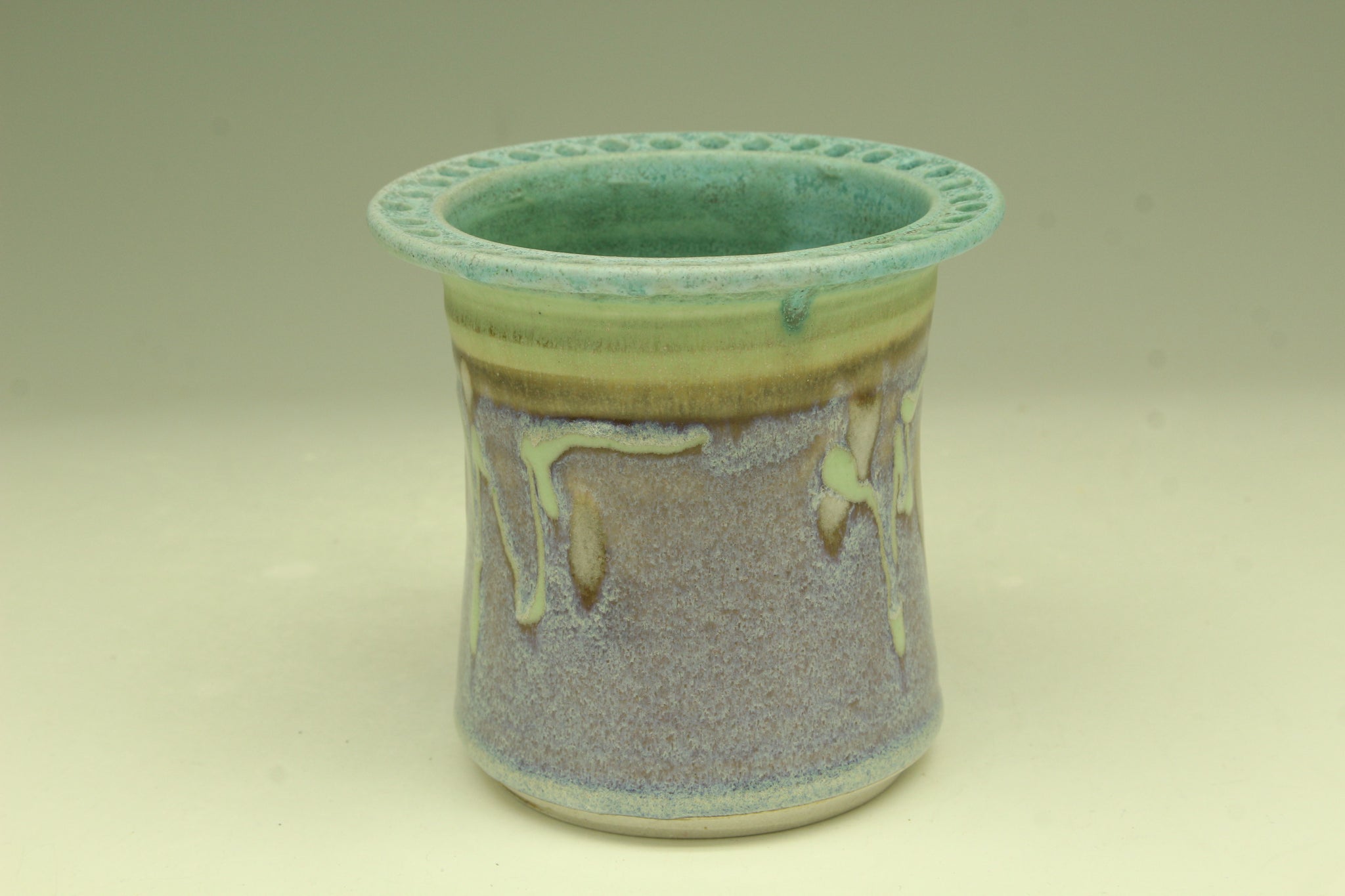 This white stoneware earring holder is thrown on the pottery wheel. It has approximately 30 holes for hanging earrings, and a cosmetic brushes holder in the middle. I glazed with the turquoise glaze and the rutile blue glaze. It is reduction fired to cone 10 in the gas kiln. I mix own lead free glazes.