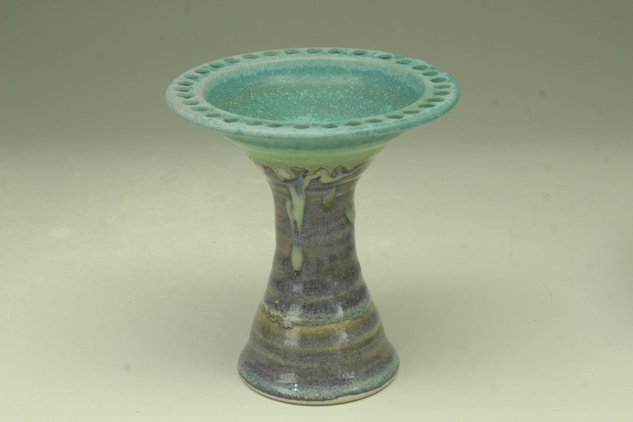 This white stoneware earring holder is thrown on the pottery wheel. It has 30 holes for hanging earrings and accessories tray in the middle. I glazed with the turquoise glaze decorated with another glaze. It is reduction fired to cone 10 in the gas kiln. I mix own lead free glazes.