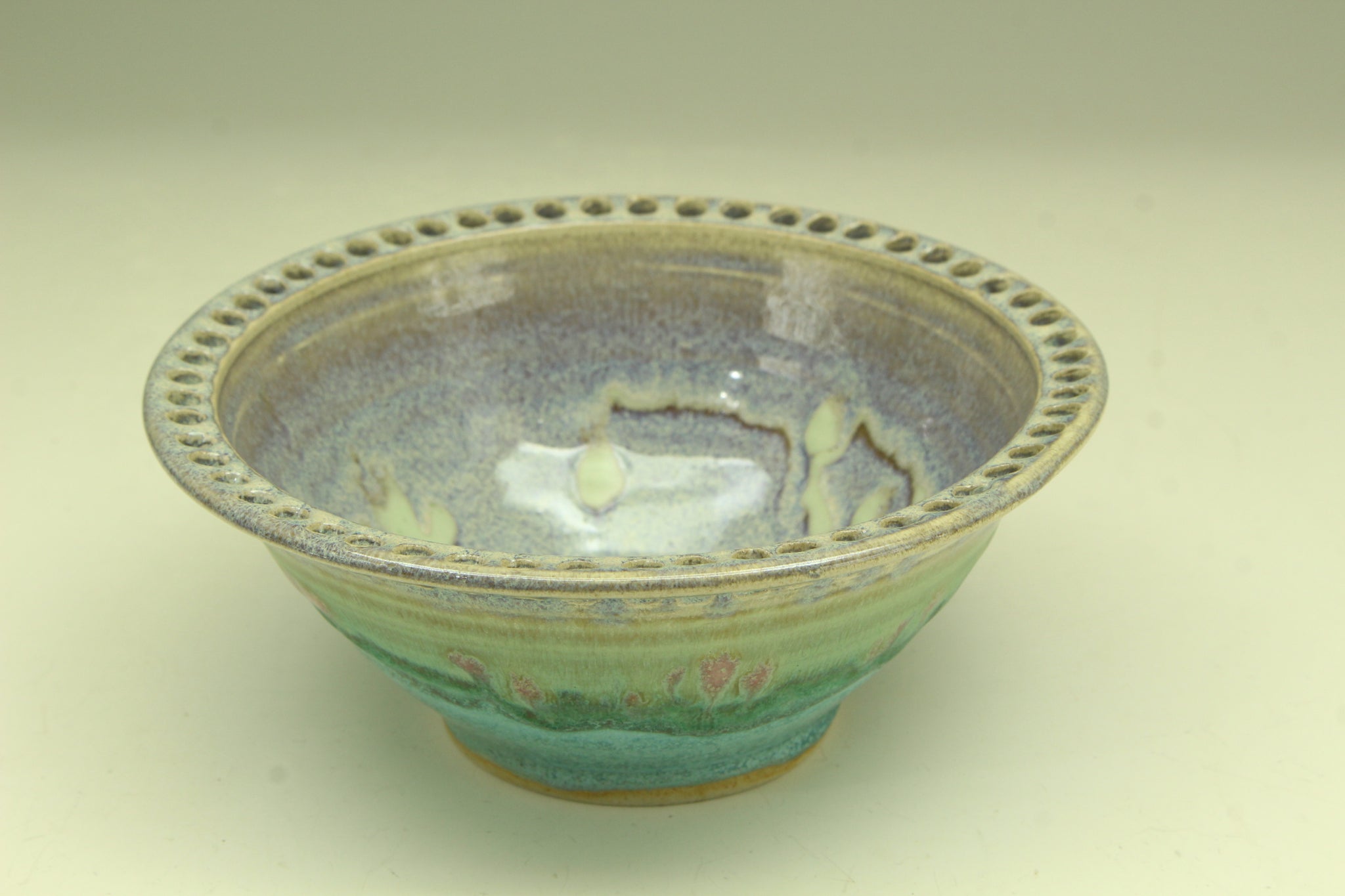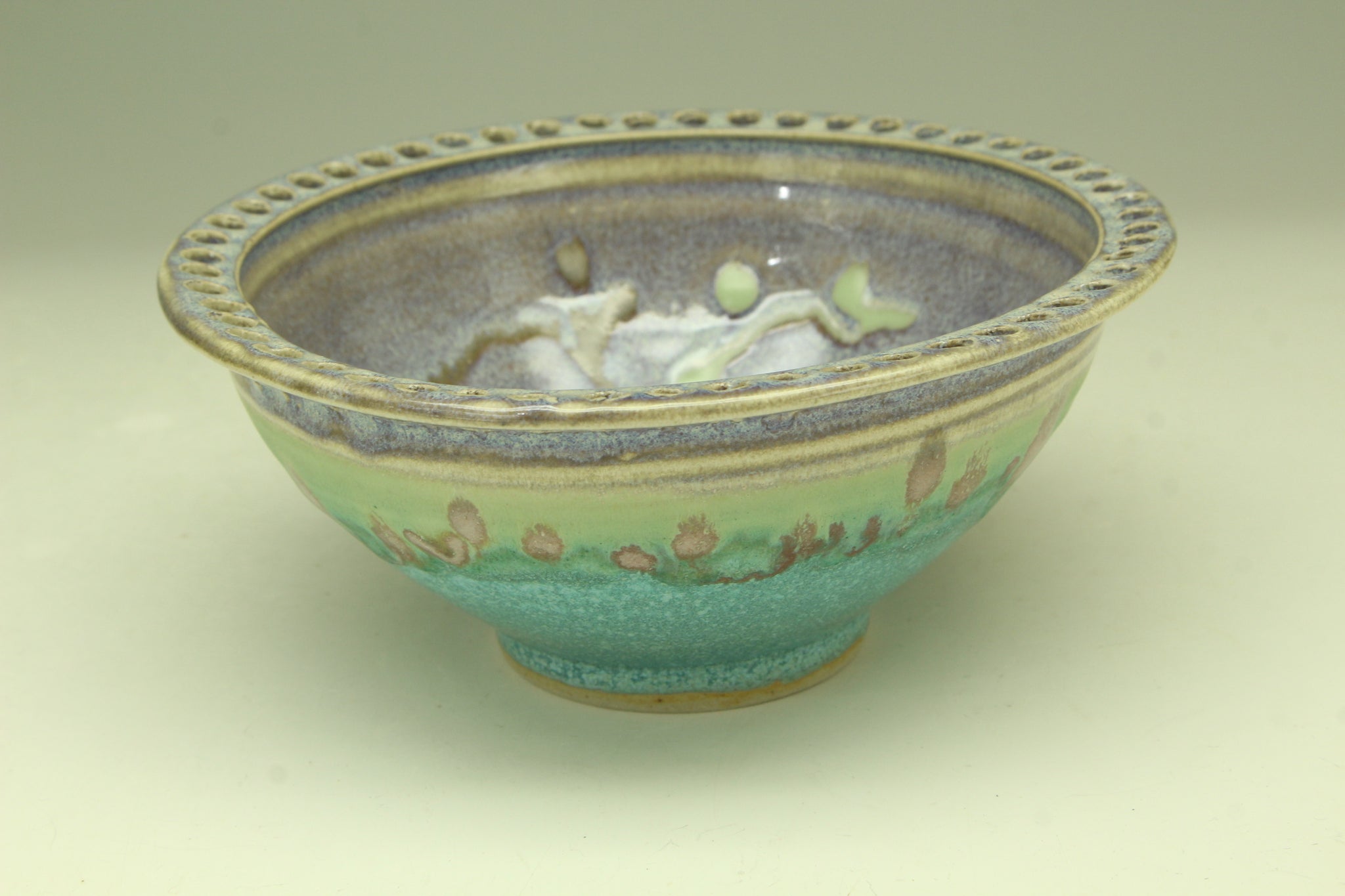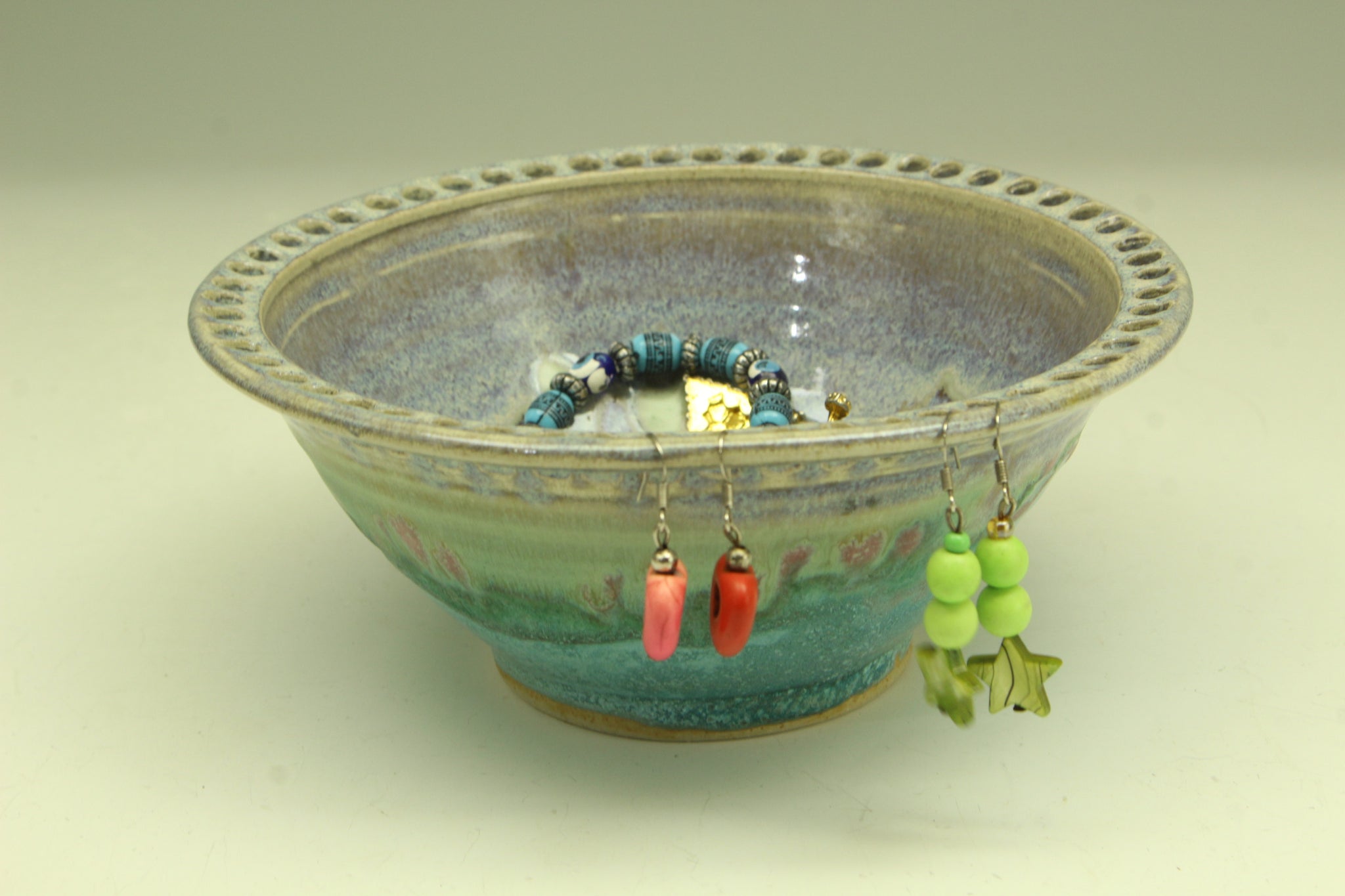 Handmade jewelry bowl & earring holder is thrown on the pottery wheel. It has approximately 50 holes for hanging earrings, and bracelets in the middle. I glazed with the rutile blue glaze and the turquoise glaze and decorated with another glaze. It is reduction fired to cone 10 in the gas kiln. I mix own lead free glazes.