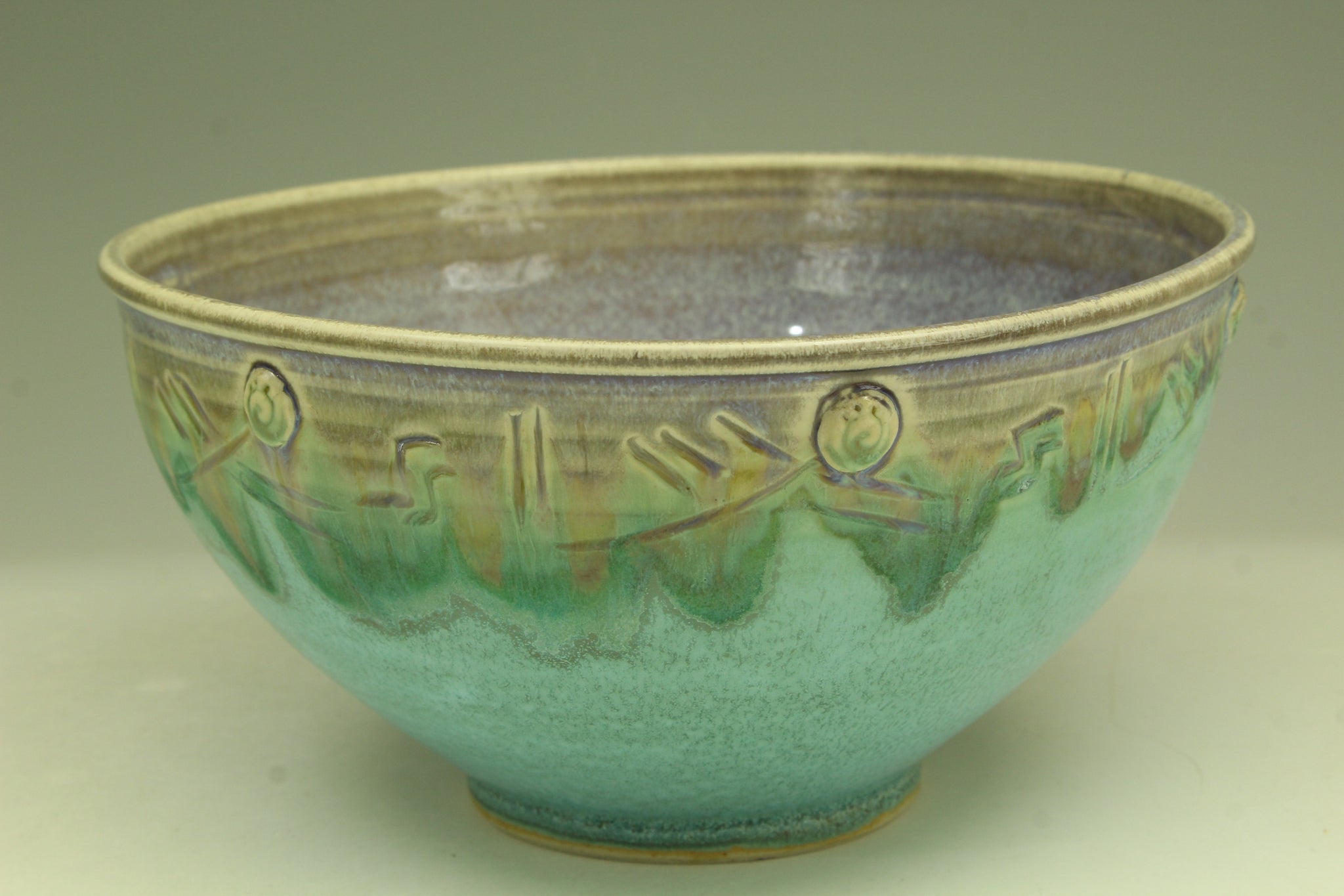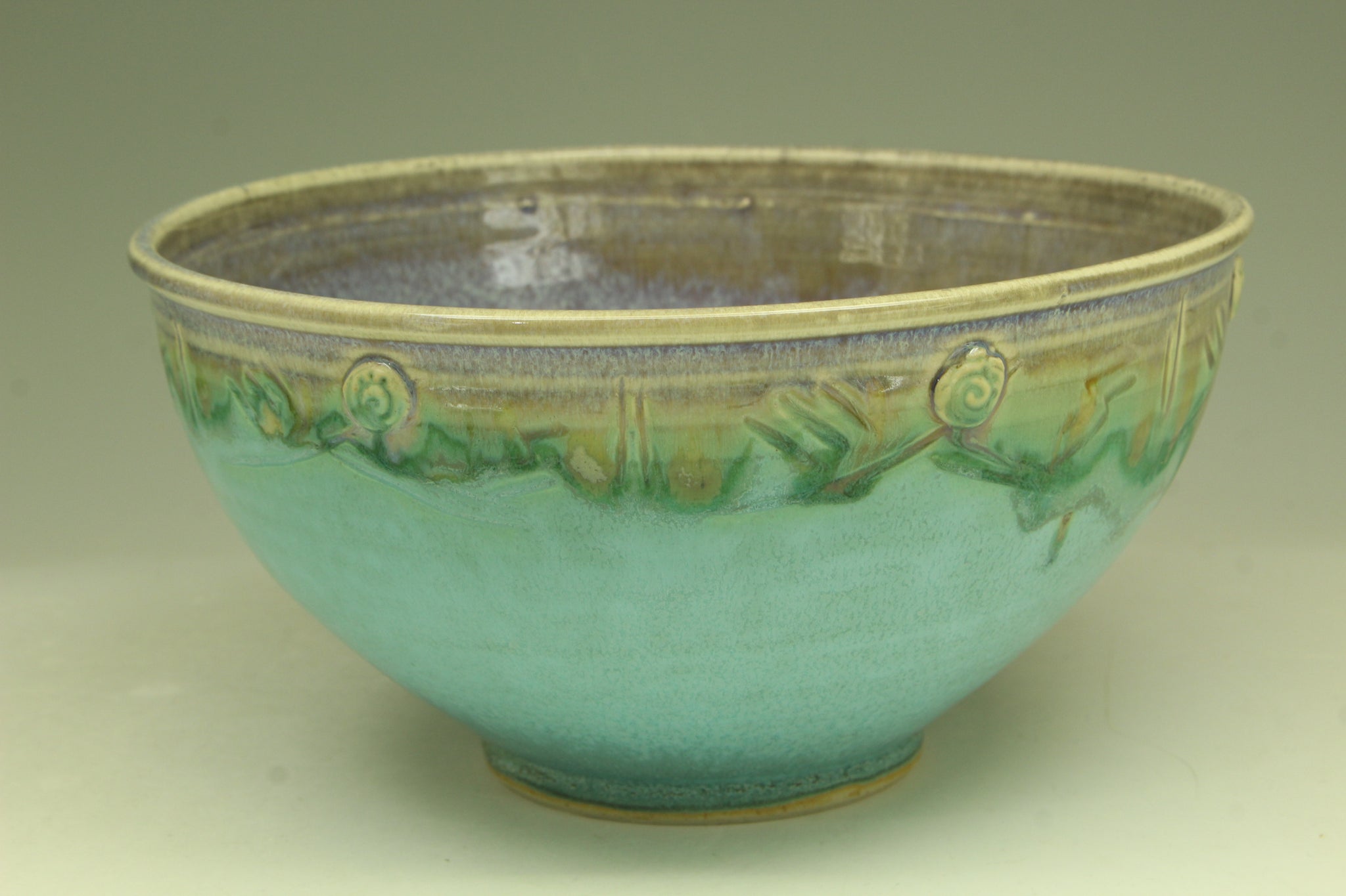 This white stoneware pottery bowl is thrown on the pottery wheel, carved and added stamp decoration. I glazed with the rutile blue glaze inside and overlapping outside with my turquoise glaze with hint of pink/red. It is reduction fired to cone 10 in the gas kiln.