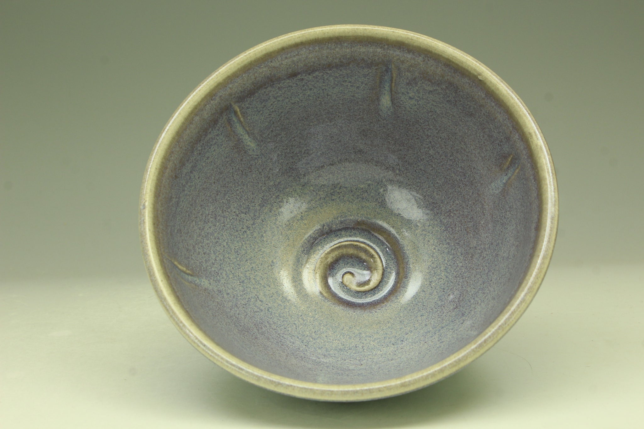 This white stoneware pottery bowl is thrown on the pottery wheel, altered and added stamp decoration. I glazed with the rutile blue glaze inside and overlapping outside with my turquoise glaze with hint of pink/red. It is reduction fired to cone 10 in the gas kiln.