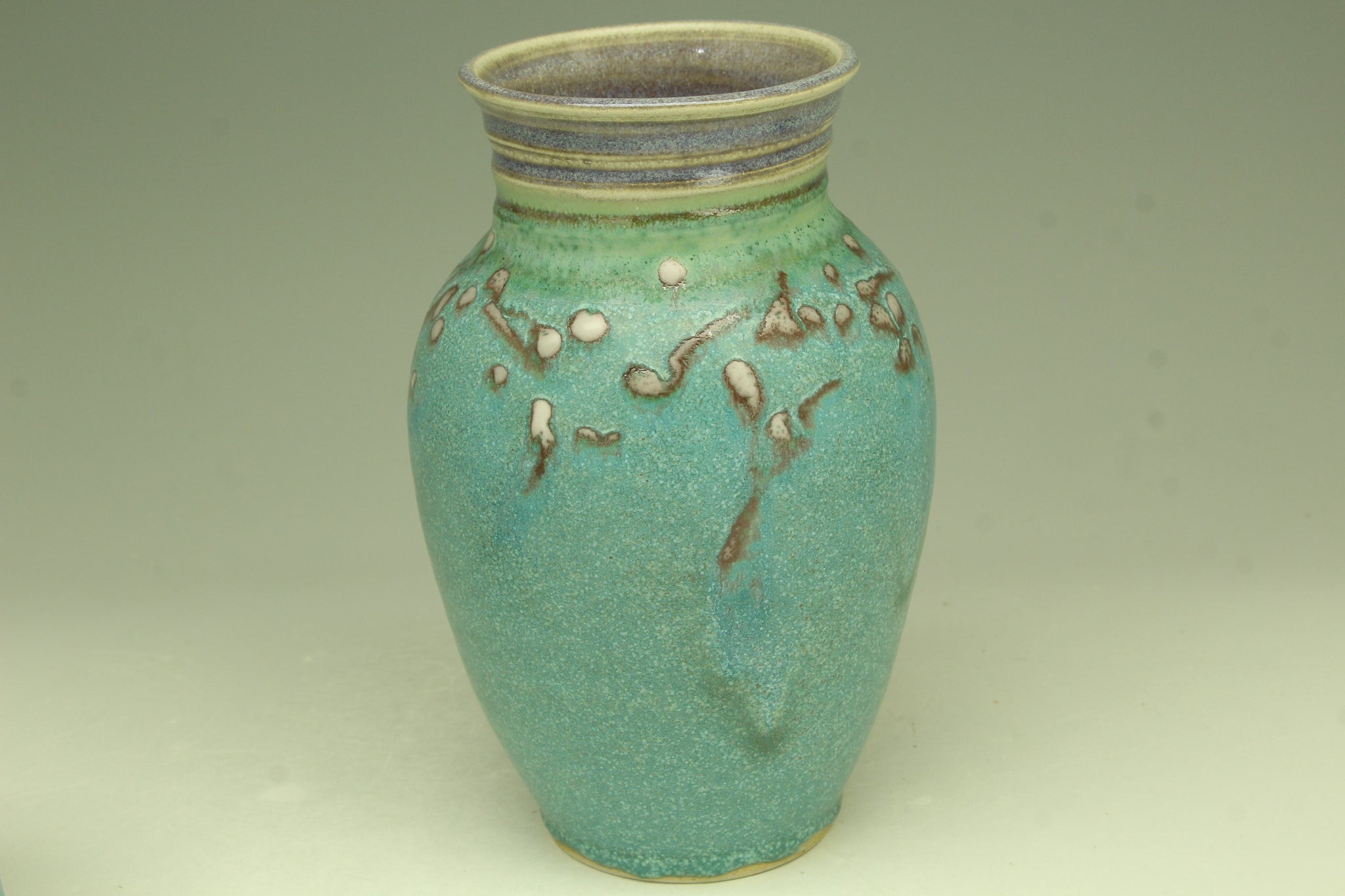 This white stoneware vase is thrown on the pottery wheel. I glazed with the turquoise glaze with hint of red/pink. It is reduction fired to cone 10 in the gas kiln. I mix own lead free glazes. The vase holds water, dishwasher safe, and looks great with a flower!