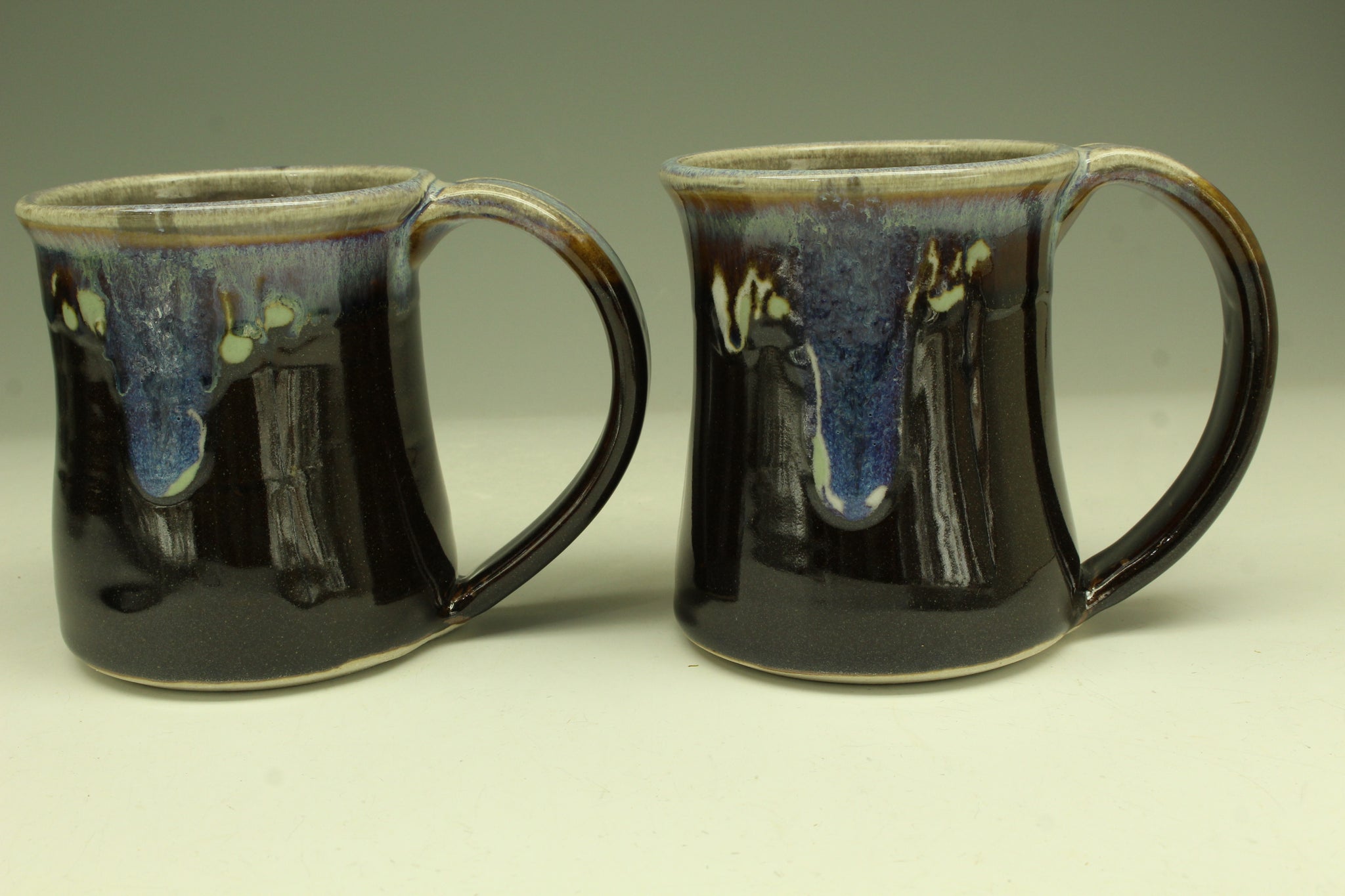 Pair of white stoneware mugs are thrown on the pottery wheel. I glazed with the tenmoku glaze and the rutile blue glaze with blue glaze. It is reduction fired to cone 10 in the gas kiln. I mix own lead and barium-free glaze.