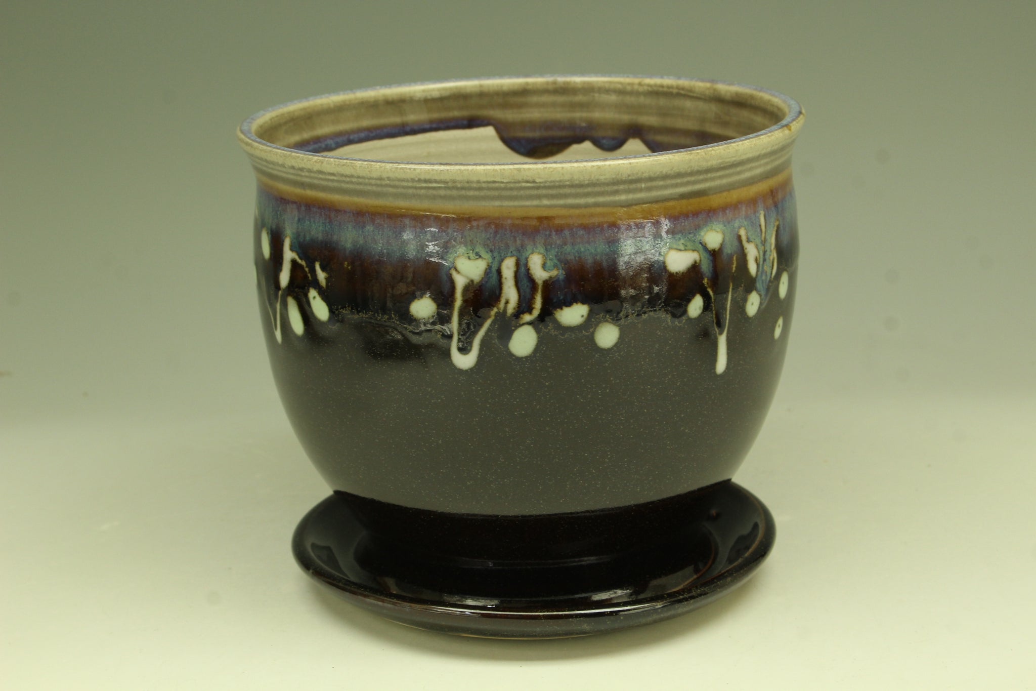 This white stoneware planter is thrown on the pottery wheel. I glazed with the tenmoku black glaze and rutile blue glaze. It is reduction fired to cone 10 in the gas kiln. I mix own lead and barium-free glaze.