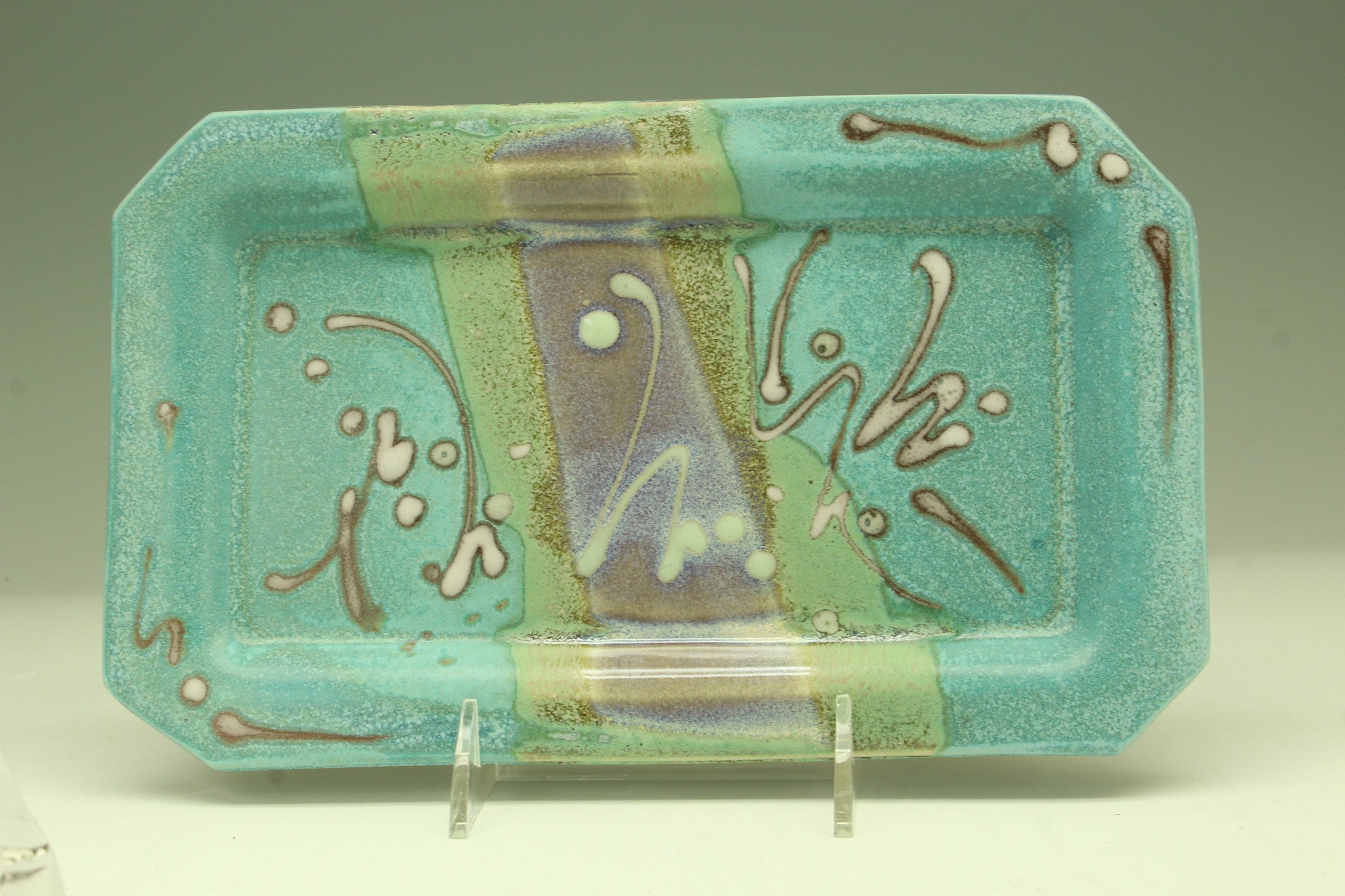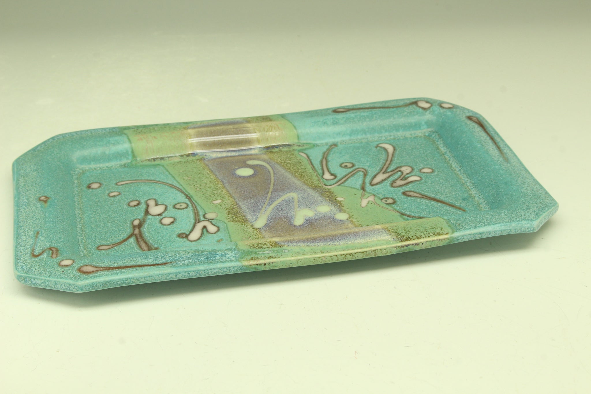 I made this white stoneware vanity rectangular tray from slabs of clay and glazed with the turquoise glaze and the rutile blue glaze. It is reduction fired to cone 10 in the gas kiln. It is food safe, dishwasher and microwave safe.