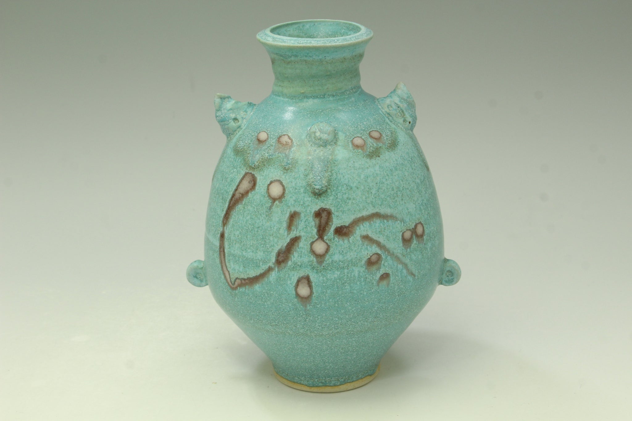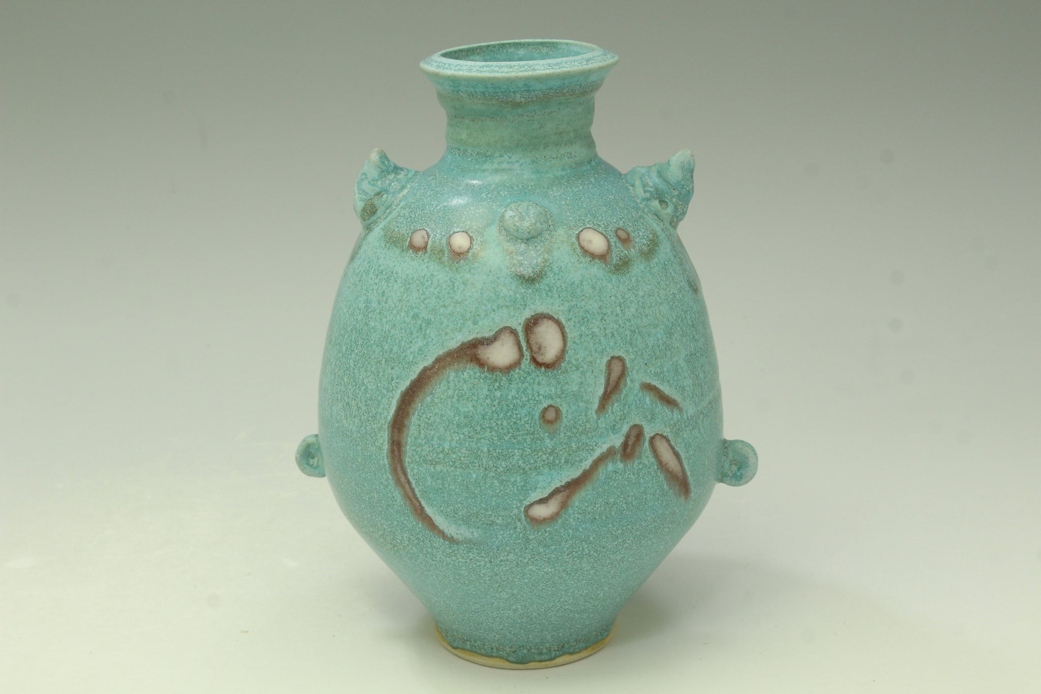 This white stoneware vase is thrown on the pottery wheel, added craving and stamp decoration. I glazed with the turquoise glaze with hint of red/pink. It is reduction fired to cone 10 in the gas kiln. I mix own lead free glazes. The vase holds water, dishwasher safe, and looks great with flowers!