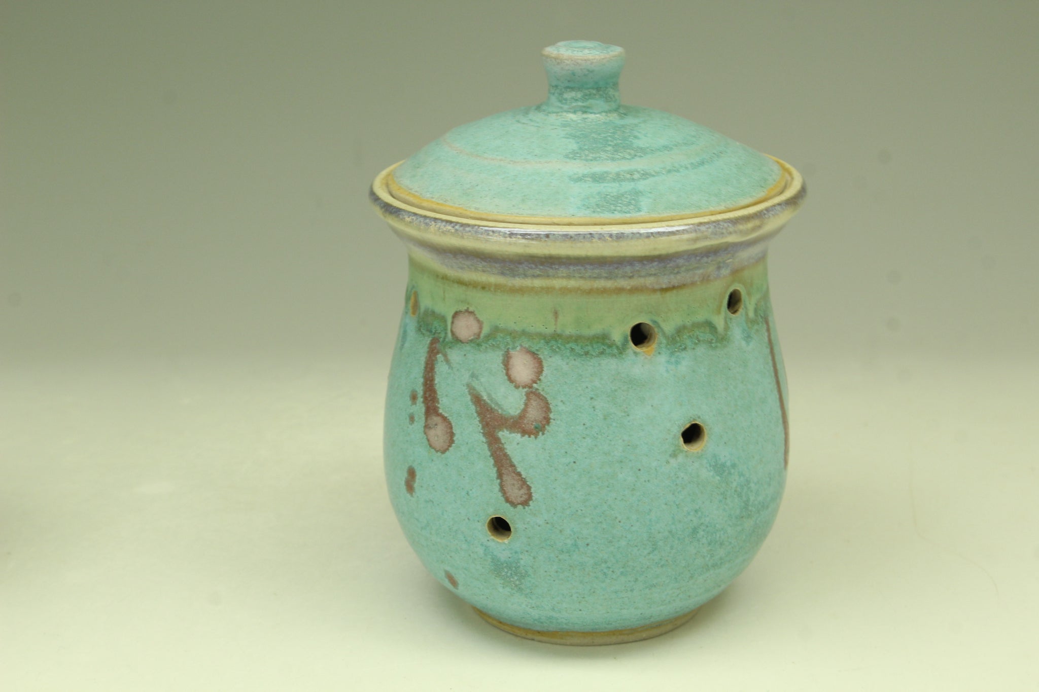 The white stoneware garlic jar is thrown on the pottery wheel. The holes on the garlic jar allow air circulation while keep the light out to prevent the garlic from sprouting.  I glazed with the rutile blue glaze inside, the turquoise glaze outside with pink/red dots. It is reduction fired to cone 10 in the gas kiln. I mix own lead free glazes. It is food safe. Enjoy!