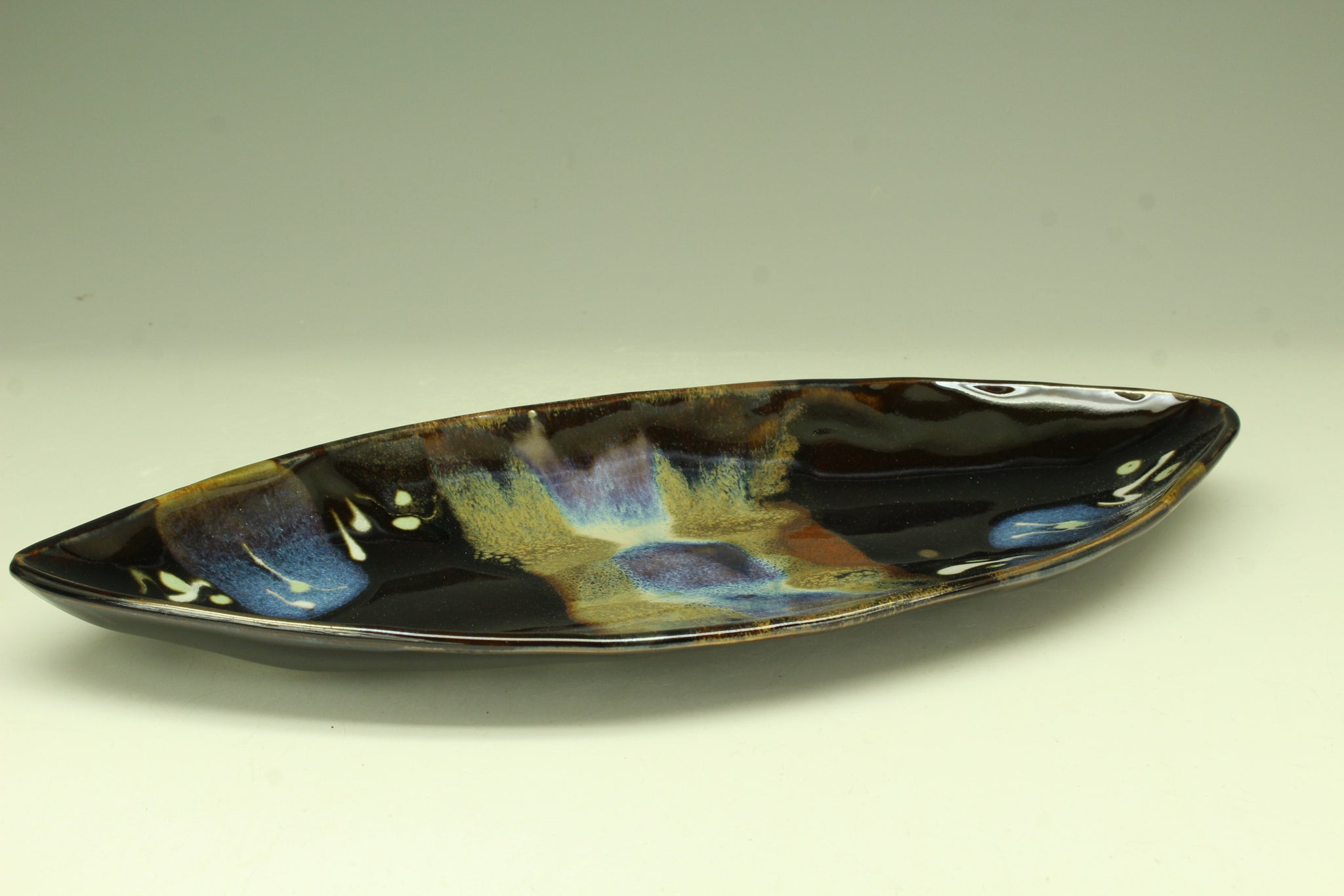 I made this white stoneware oval tray from slabs of clay, then added handles, and glazed. It is reduction fired to cone 10 in the gas kiln. It is food safe, dishwasher and microwave safe.