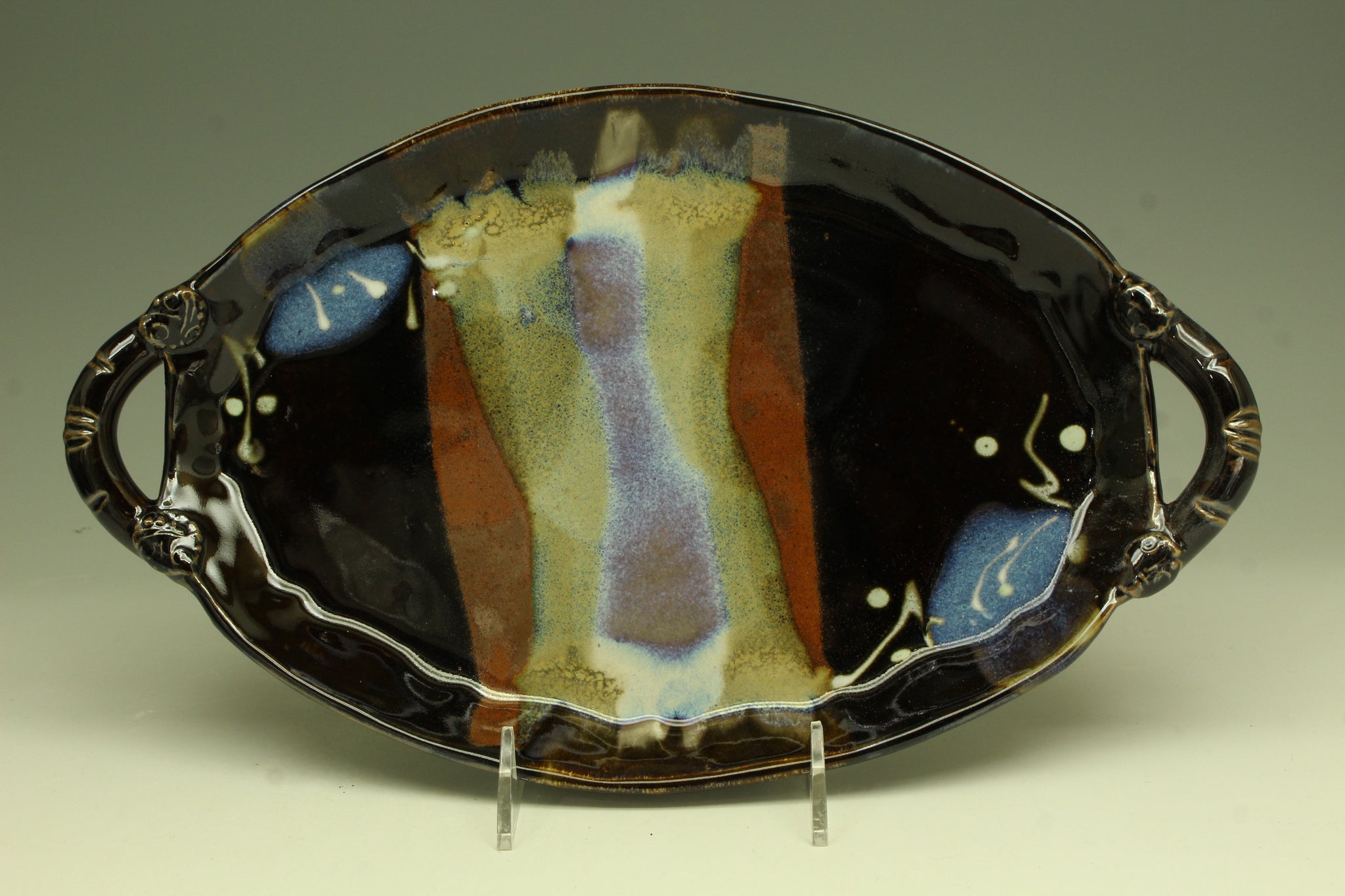 I made this white stoneware oval tray from slabs of clay, then added handles, and glazed. It is reduction fired to cone 10 in the gas kiln. It is food safe, dishwasher and microwave safe.