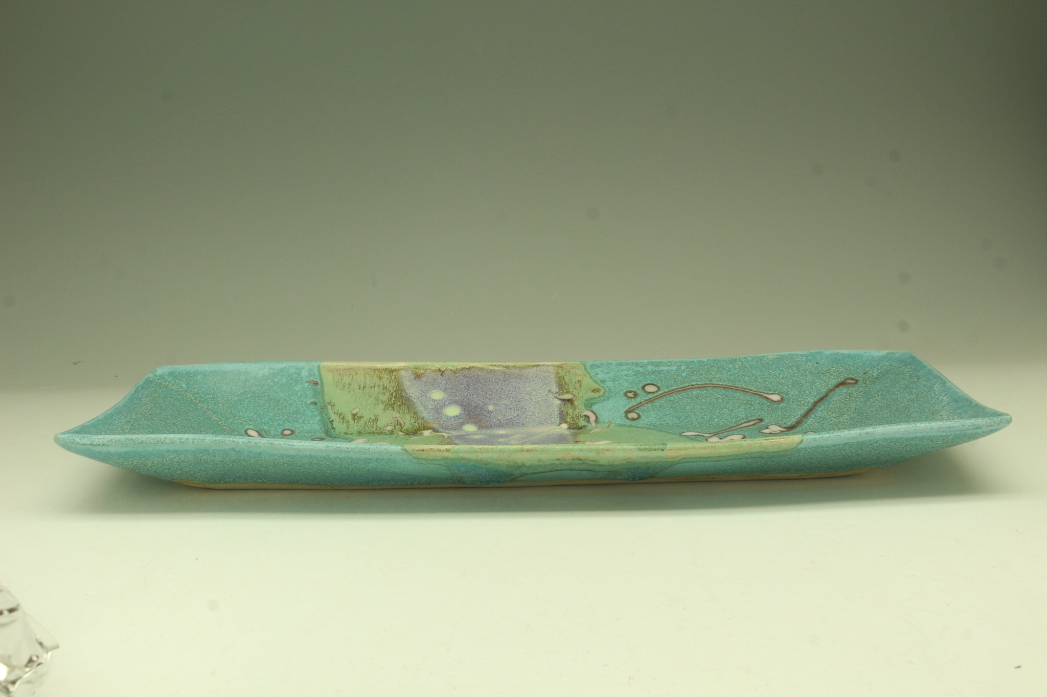I made this white stoneware rectangular tray from slabs of clay and glazed with turquoise glaze and rutile blue glaze. It is reduction fired to cone 10 in the gas kiln. It is food safe, dishwasher and microwave safe.