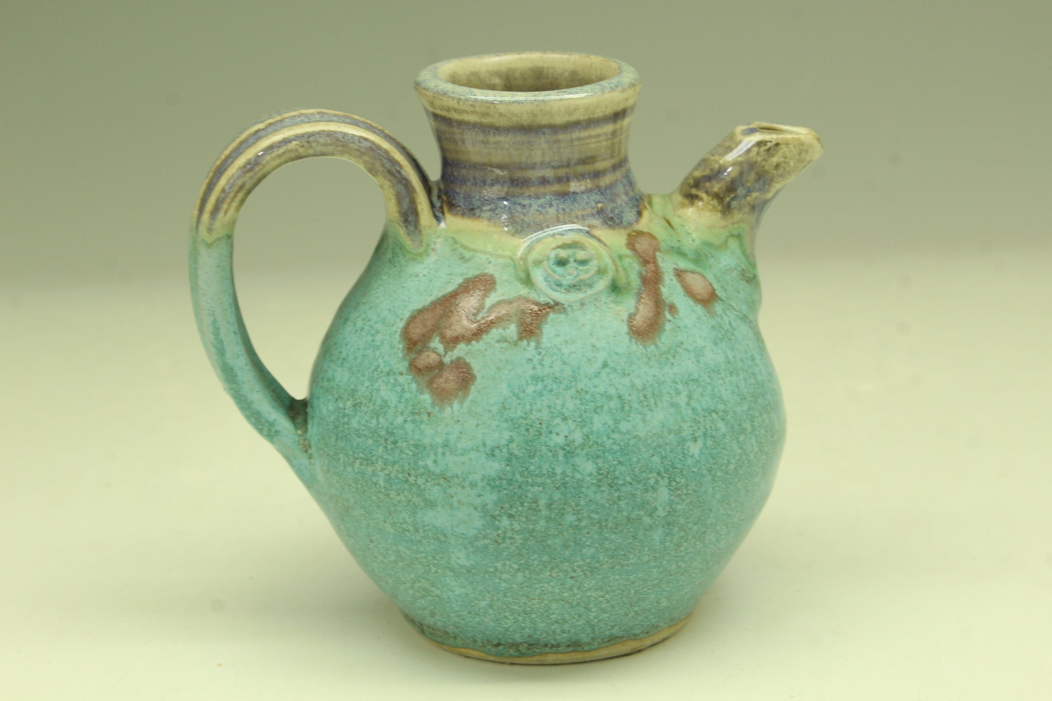 This white stoneware sake bottle is thrown on the pottery wheel. I glazed with the rutile blue glaze inside and overlapping outside with the turquoise glaze with hint of red/pink decorations. It is reduction fired to cone 10 in the gas kiln. I mix own lead free glazes.