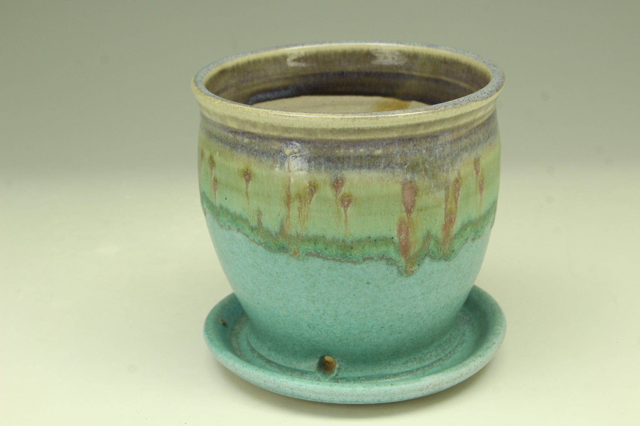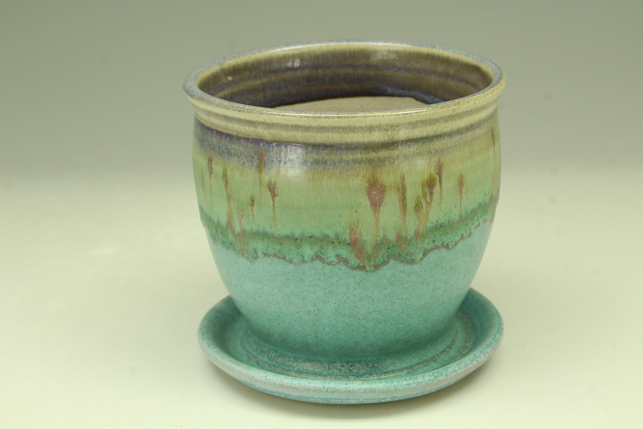 This white stoneware planter is thrown on the pottery wheel. I glazed with the turquoise glaze and rutile blue glaze. It is reduction fired to cone 10 in the gas kiln. I mix own lead and barium-free glaze.