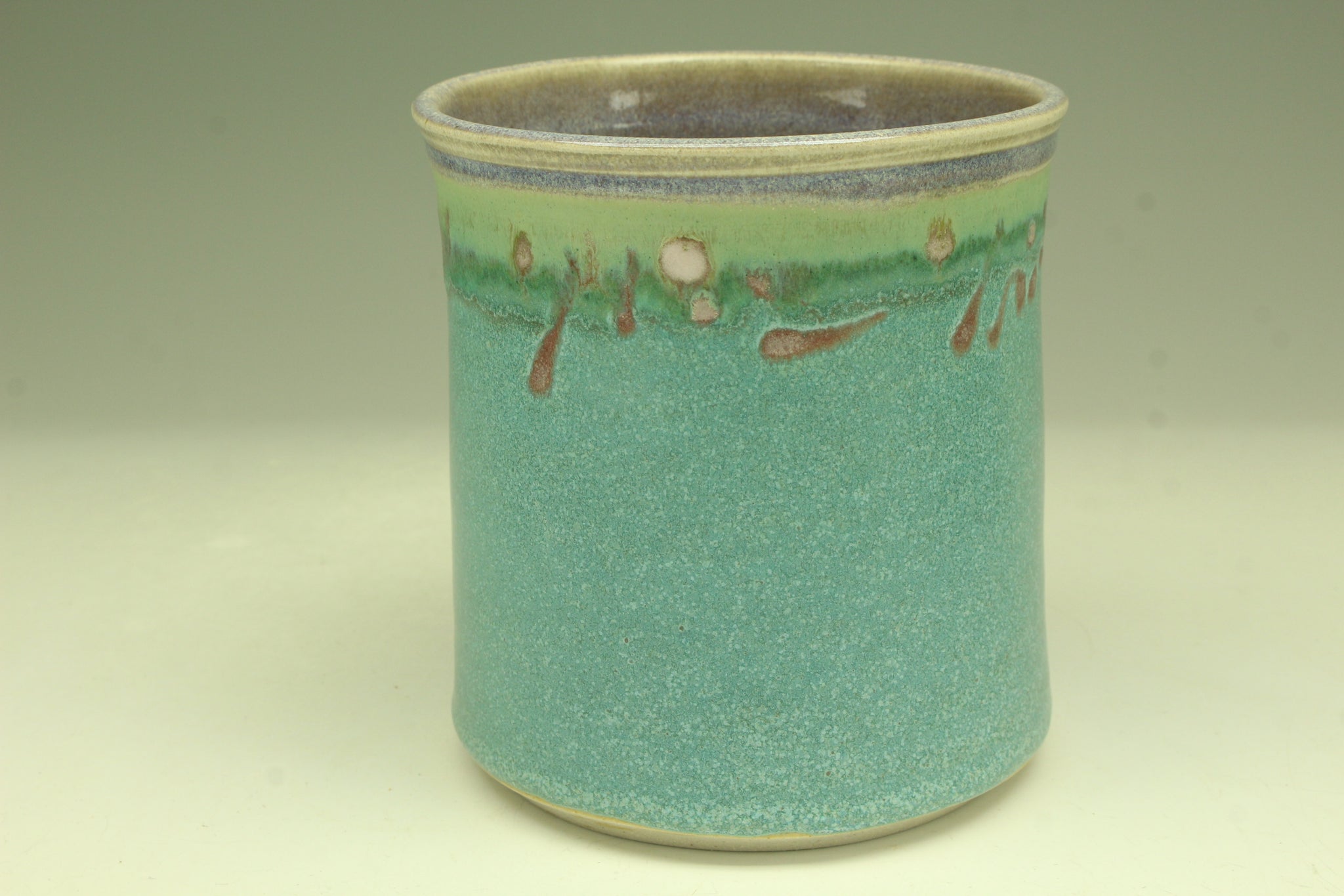 This white stoneware utensil holder is thrown on the pottery wheel. I glazed with the turquoise glaze and the rutile blue glaze. It is reduction fired to cone 10 in the gas kiln. I mix own lead and barium-free glaze.