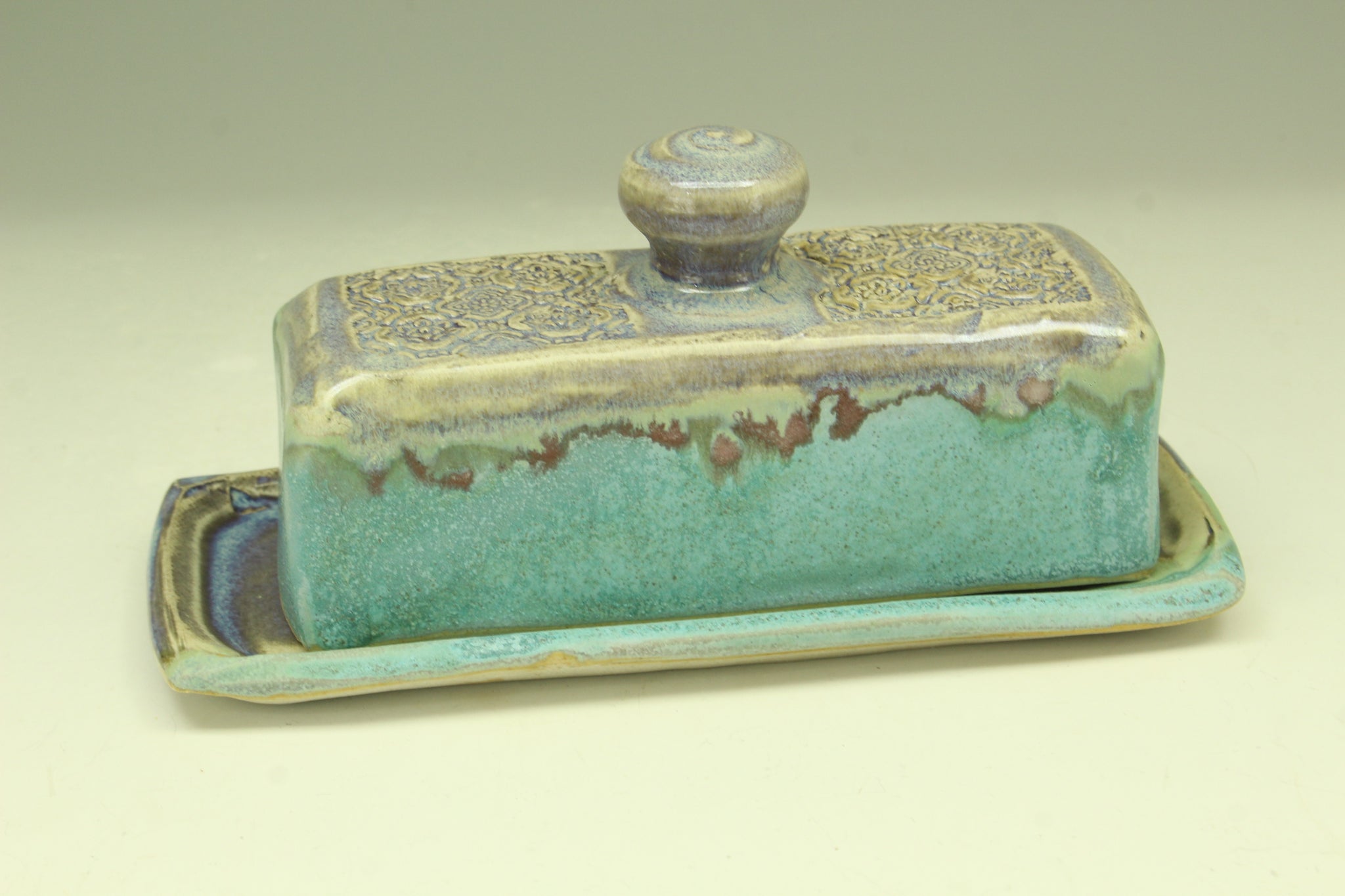 This white stoneware covered butter dish is assembled with slabs of clay, applied stamped decoration, and glazed with the turquoise glaze and the rutile blue glaze. It is reduction fired to cone 10 in the gas kiln. It is food safe, dishwasher.